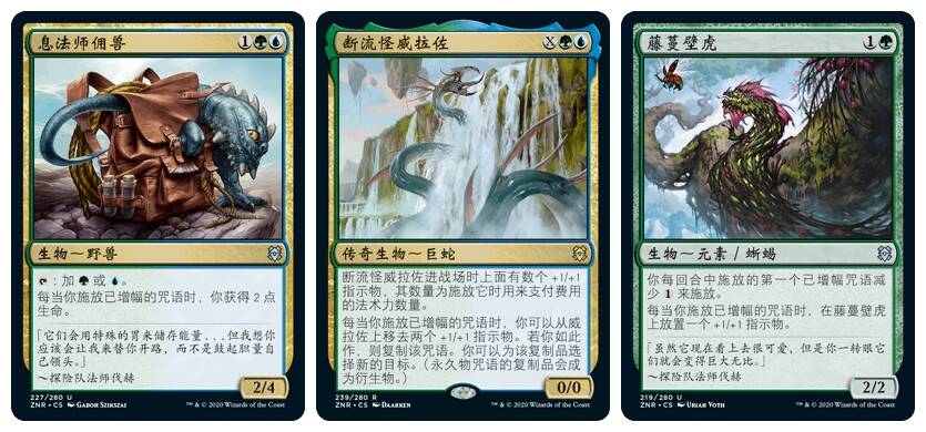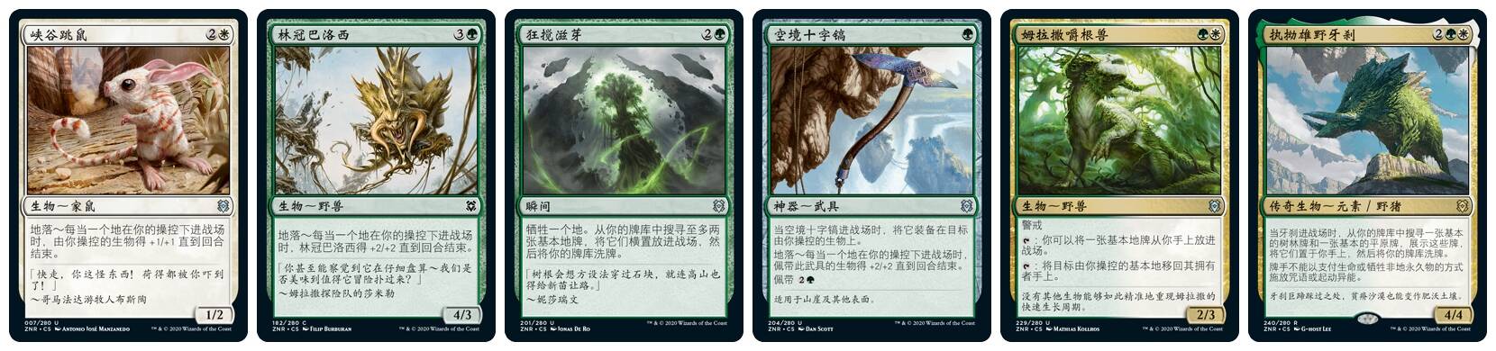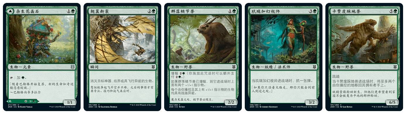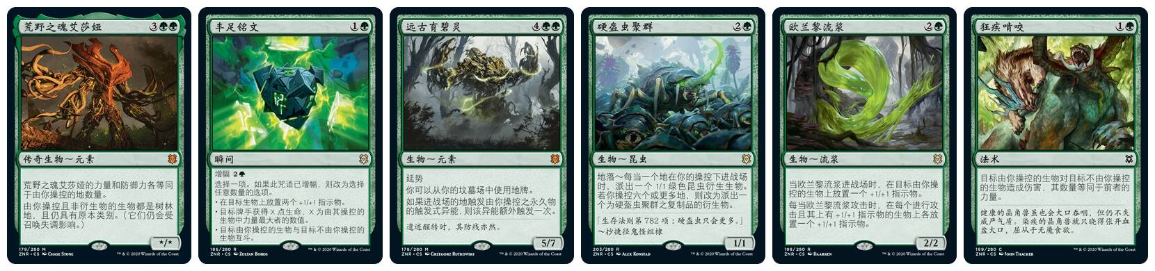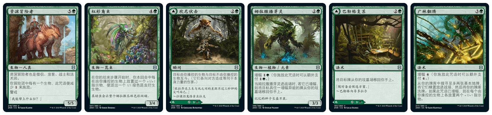 绿色真是我一个又爱又恨的颜色,我个人最喜欢绿色的特色,在这个环境中,他几乎没有什么废牌,而他最大的问题是,整体不强!可混色,有回血,有过牌,有杀,有冒险团,有地落,样样都有,就是不强。。你抓绿色只能求3胜,除非你捡了炸弹,但你有炸弹时别人其实也有。他的铁牌几乎没有一张废牌,但也没有一张特别强的牌,狂疾啃咬、翅翼断裂是比较普通的杀,特裘如枯刃客、玖瑞加幻视师、群落糙节兽、林冠巴洛西、卡赞度跺地兽、姆拉撒之力这些都挺有用的。银牌有虹彩角虫算是和黑绿里面比较强的牌,资深冒险者也算是通用的强牌,广林翻腾属于用出来比较有爆发力。金牌之中,丰足铭文、硬盔虫聚群、欧兰黎流浆算是比较好的炸弹了,丰足铭文可以攻击或格挡再发动,可以1换2+回血。