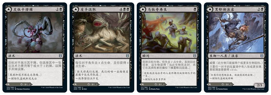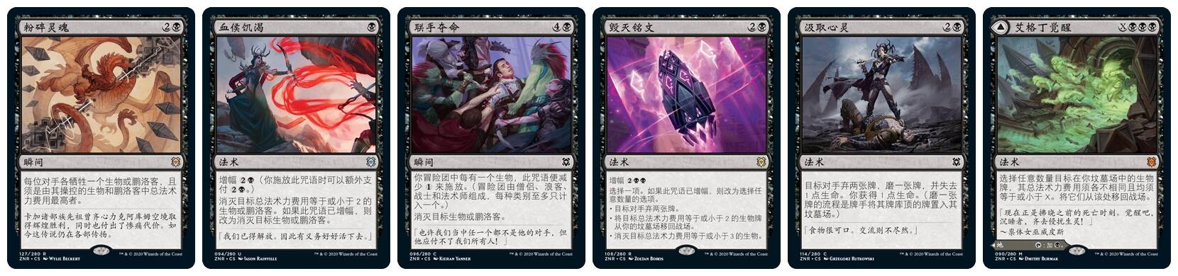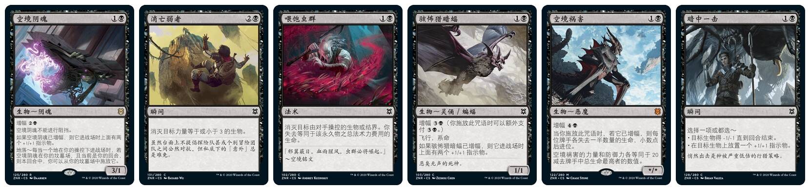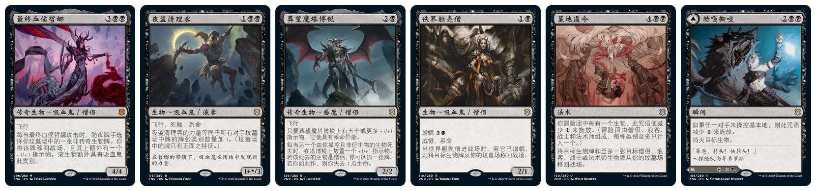 黑色去除多,请认准第6、7、8、9、14、15这几张牌,全部是硬性去除,性价比非常高,与任何牌组兼容性都强,推荐放4张左右不同的黑杀。还有存在很多如佚界躯壳僧、墓地逼令、汲取心灵、鲜血招诱这种1换2的牌,汲取心灵推荐下2张,对面多强的套牌被你一弃牌直接废了一般,快攻和慢牌一样的难受,最好是等他大概有3,4张牌的时候出效果最佳,这个时候地基本下完,手里要么有大哥要么有过牌。骇怖猎暗蝠感觉是黑色铁牌里面最强的生物,飞行+系命通用性太强了,又能**。最后4张是双面牌,第一张可以算为强力双面牌,3费准时出可以去除一些大哥,接下来对面明牌打,其余的当免费地牌用吧。