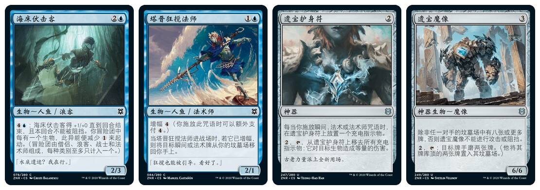 海床伏击客其实强度不算强,但是一种制胜方法,需要你的牌组冒险团数量多。塔晋狂搅法师这种一来可以补2费曲线,2来可以赚,比较好用。蓝有4张铁牌都是法师,如果你抓蓝法师多,遗宝护身符是可以拿的,可以当做硬性去除。遗宝魔像属于高风险高回报单卡,组磨牌的时候效果不错,但也会遇到卡住的情况。