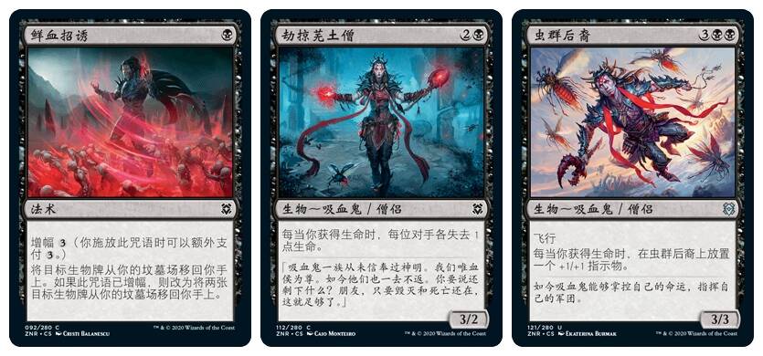 劫掠芜土僧和虫群后裔在黑白里面会很强,劫掠芜土僧甚至属于核心牌,和寇族主祭搭配可以挂机不用进攻就能取胜,白黑一定要多抓。如果你套牌有一些炸弹,那鲜血招诱的重复利用非常强,回收遗迹蟹收益非常大。