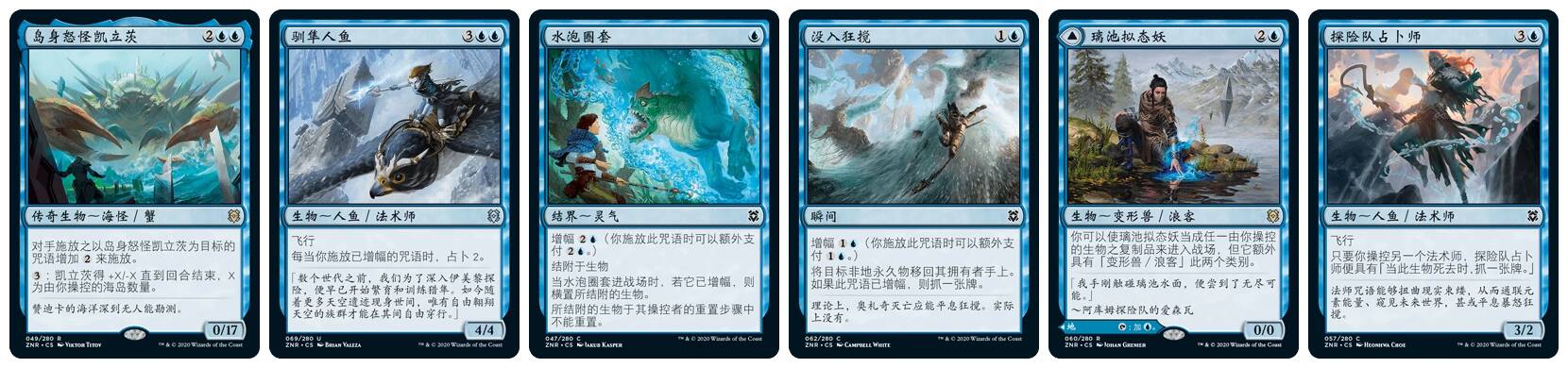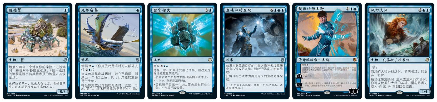 蓝色的特点是有一些强节奏的牌,如水泡圈套、狡黠热泉法师、没入狂搅这种会让对手场面跟不过来从而处于劣势。有空境劫掠、实地勘验提供过牌保证后期能力。遗迹蟹!这个环境最强的牌没有之一!不接受反驳哈哈哈!如果你是组蓝黑,看到直接拿吧,这才是上限最高的牌,牌都丢掉了你怎么跟我谈卡组强度?高端局你可以第一回合下这个然后等待一下,说不定对面直接投降了,我很多时候都是靠这张牌赢的,你说哪有炸弹有这么稳定的收益。龙兽宿巢和息法师的支配也是强度非常高的牌,而且都是银牌。总体来说蓝牌有强牌也有弱牌,但某些强牌真的非常之强。