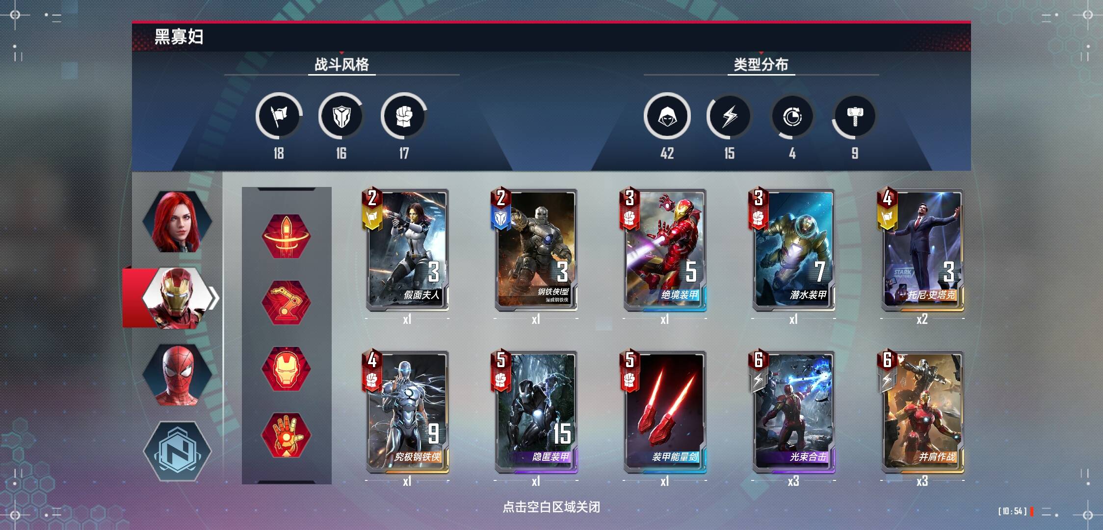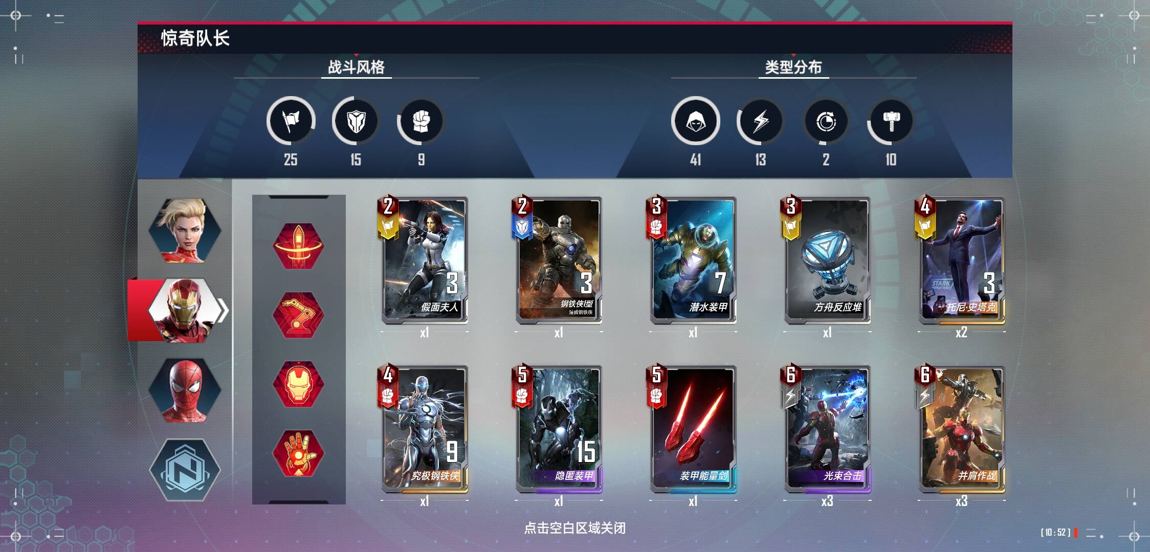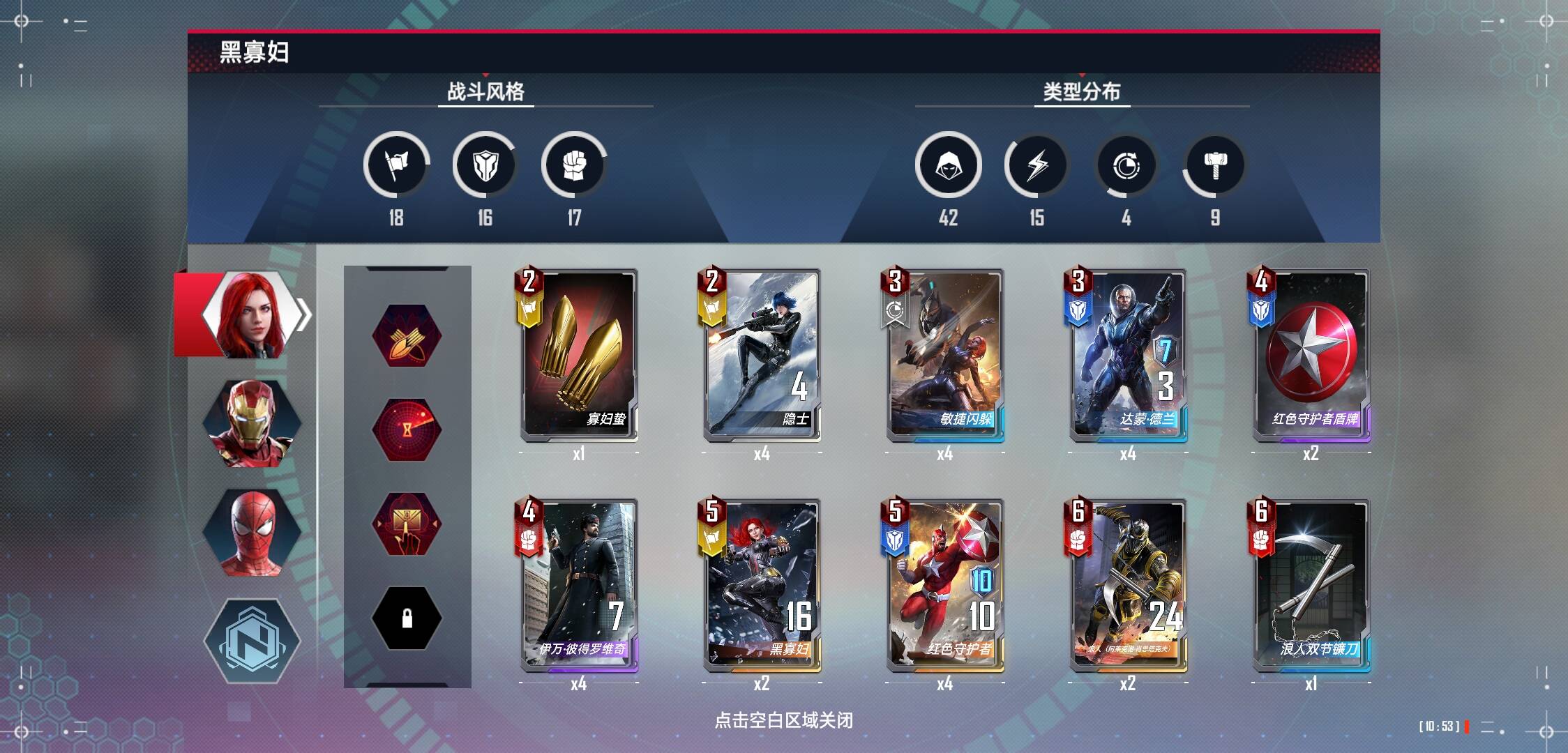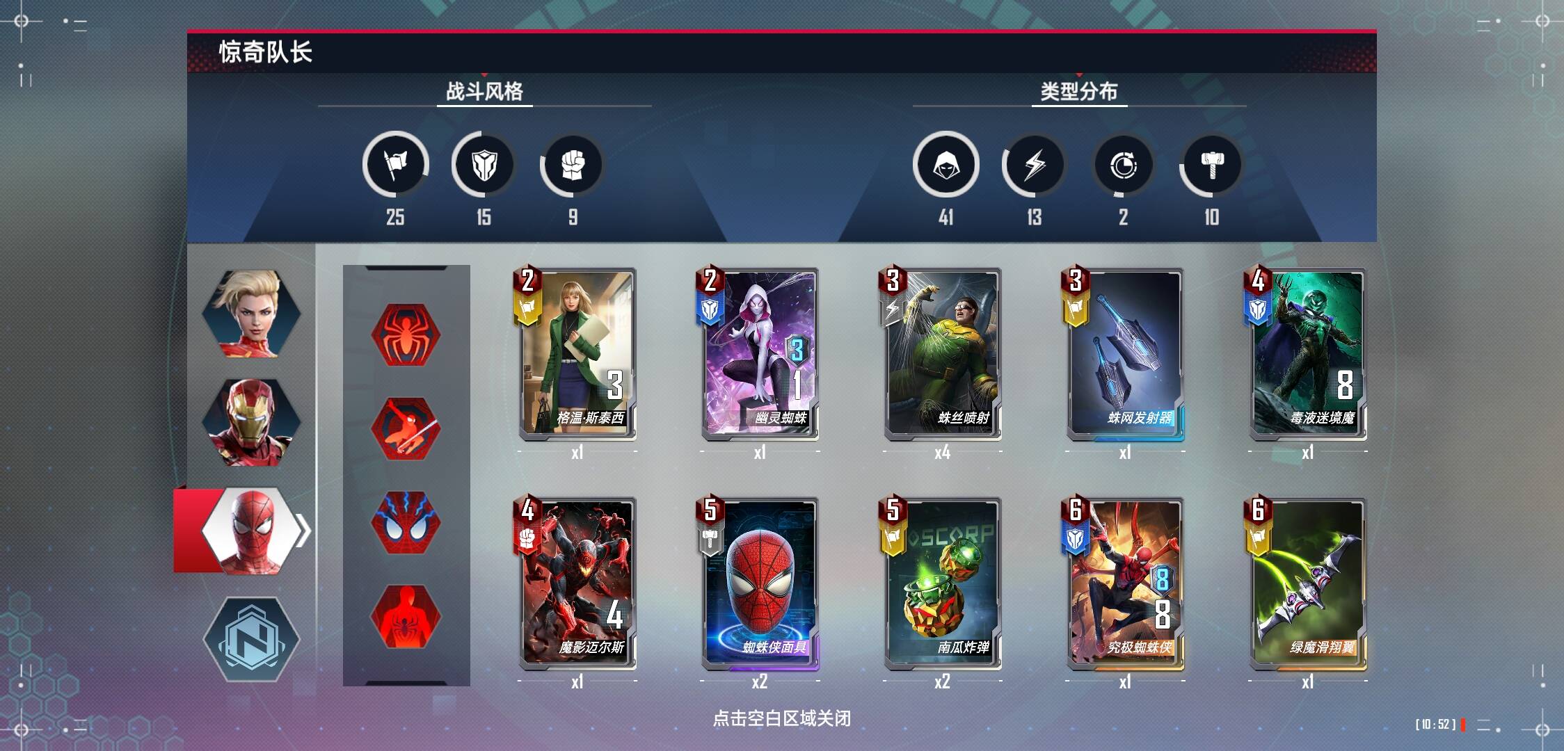 隐匿流也有多种思路,比如给【索尔蛙】装上【红色守卫者盾牌】,通过隐匿特工行动不断触发【索尔蛙】效果;而这套思路是用【奥创】给【黑寡妇】多次行动机会,配合蜘蛛侠的【蛛丝喷射】、【绿魔滑翔翼】等超强控制体系让隐匿特工稳定行动偷取战力,优势是控制强稳定先手,弊端是怕惊奇队长、【光束合击】和【安吉拉】。