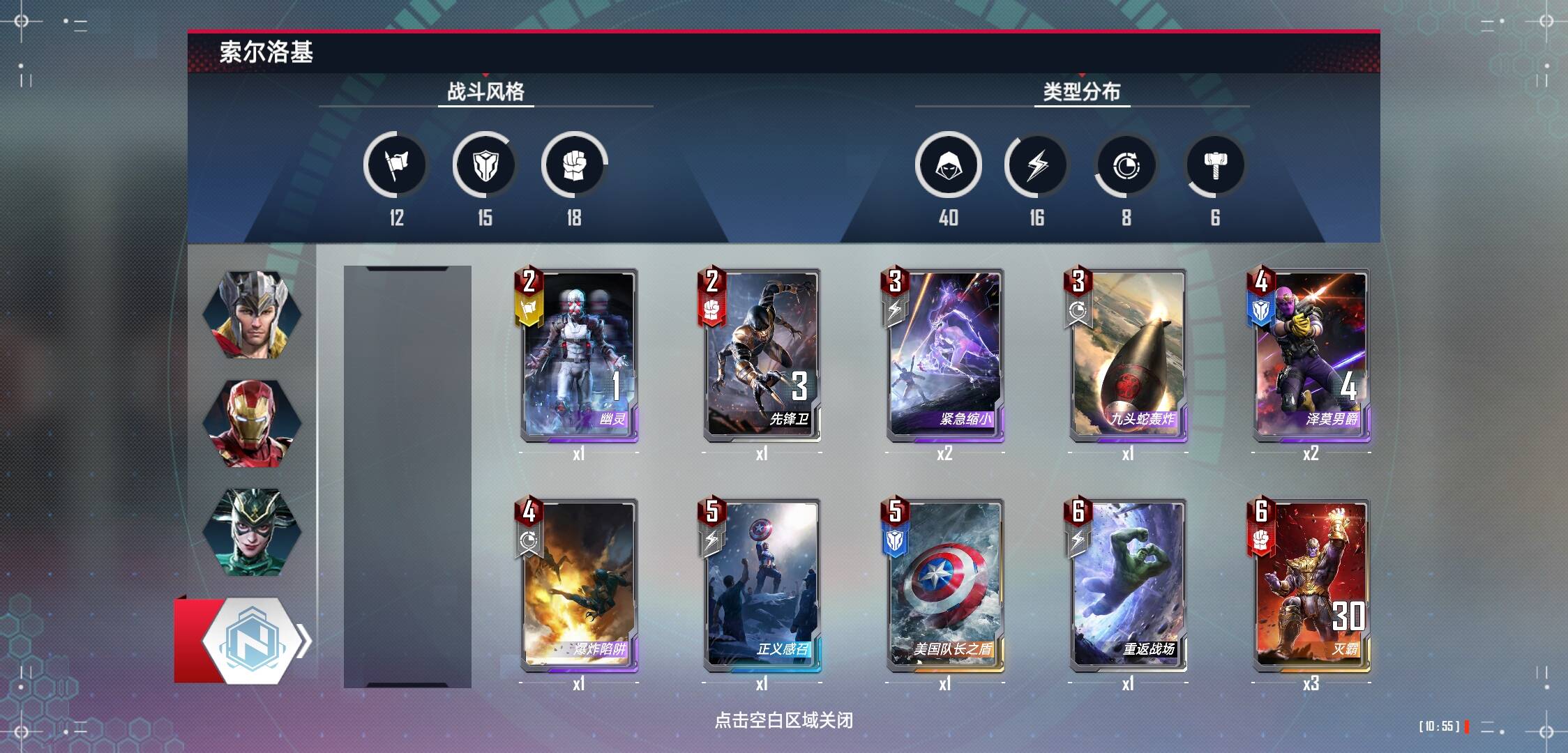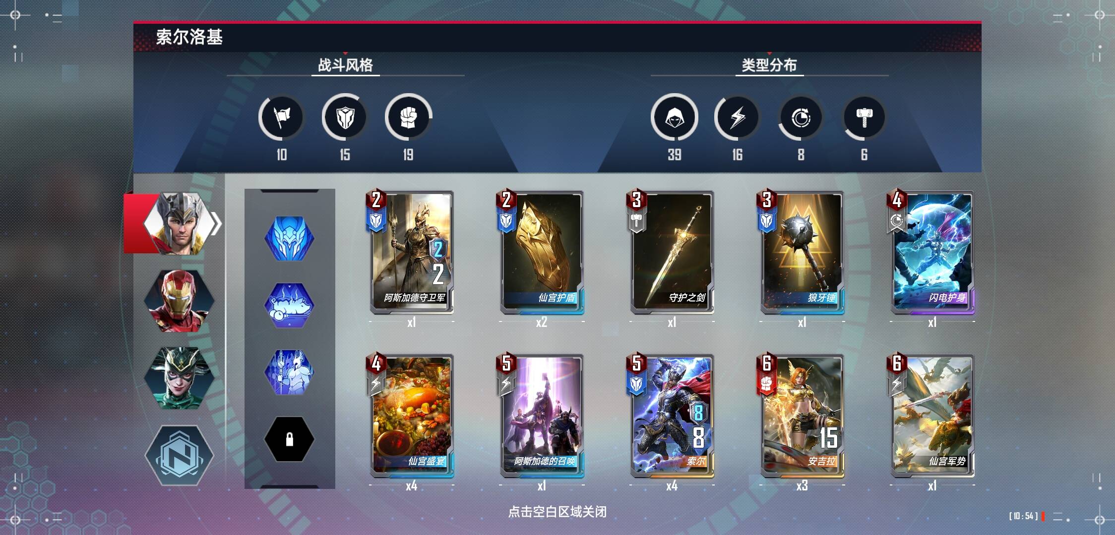 首先声明这套卡组比较贵,适合卡全的老玩家,新手请自动跳过。常规索尔因为节奏缓慢不适合天梯,那么这套需要搭配钢铁侠辅助,前期拿最强战力不刷牌直接升级商店,用【紧急缩小】【斯塔克】【绯红机甲】这些理财卡赚经济,升到6级刷牌拿【索尔】、【安吉拉】、【苏尔特尔】和【灭霸】,靠这些卡处理残局。