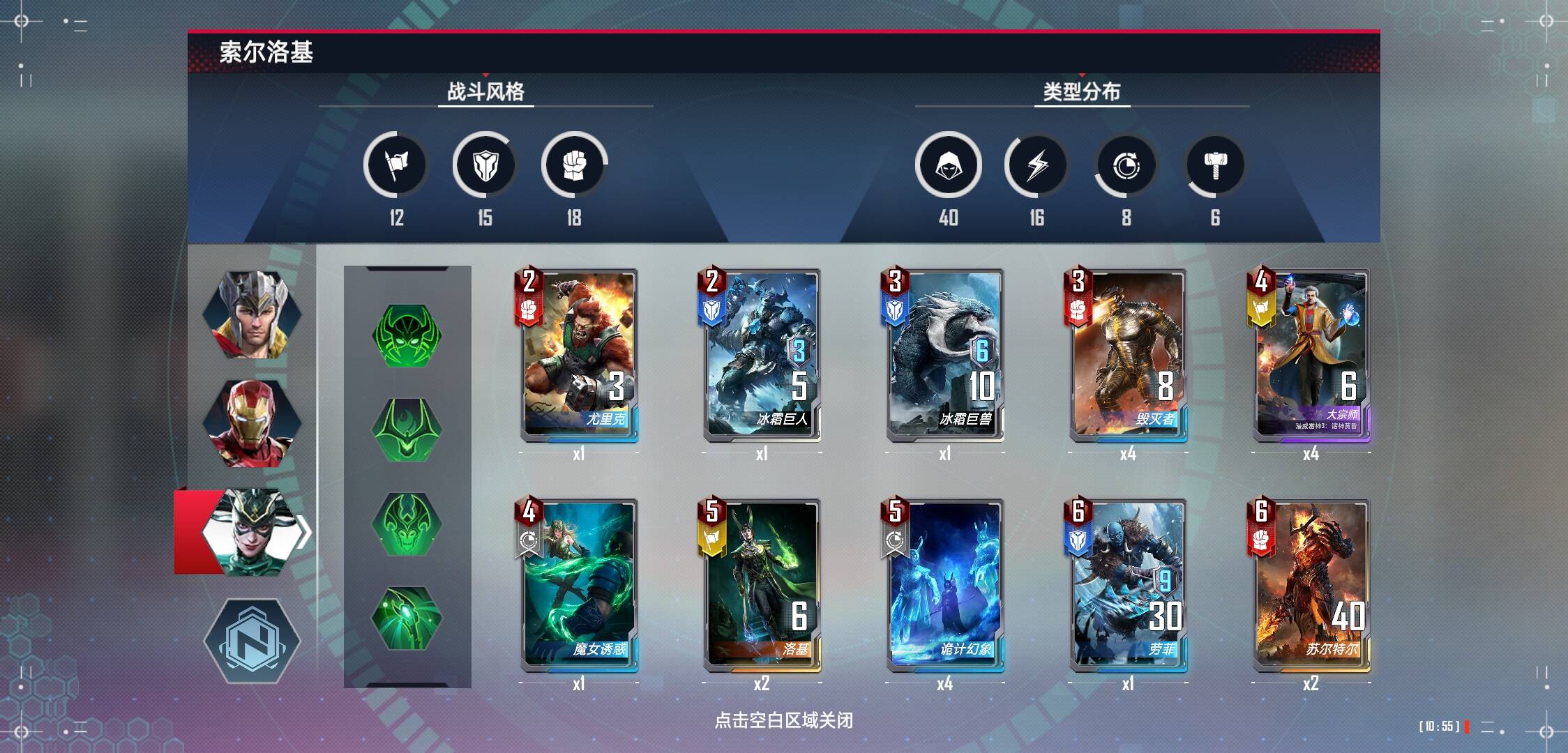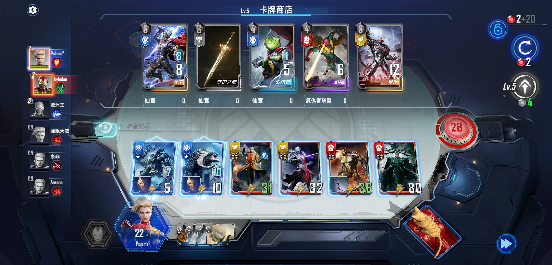 洛基依然延续上版本的强势,卡组相较于上版本变化不大,思路依然是冰霜系工具人带守护装备,触发【大宗师】复制【洛基】,【诡计幻象】确保末位【洛基】被击杀依然能补充战力。运营建议是前期拿最高战力尽量不刷牌速升5级,优先选奖励宝石的适用技能,索尔和钢铁侠的刷新商店技能都不错。