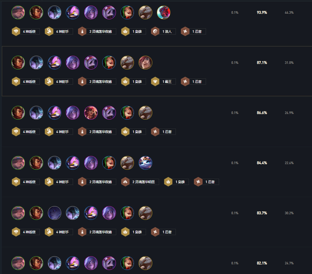 上图来自官网数据库。大家能看到神盾射手选择率超低,但前四吃分率超高,大部分阵容在80%之上,9人口的最高吃分率高达惊人的93.9%;吃鸡率在也稳定在20%以上,最高吃鸡率惊人的达到44.3%。