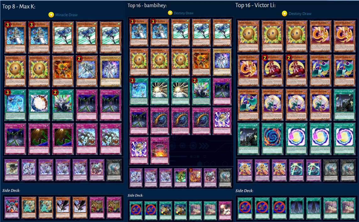 截至32强,白龙卡组和枪龙卡组的数量最多,各为5套,电子龙和圣骑士卡组的数量次之为3套(圣骑士卡组证明还是有些东