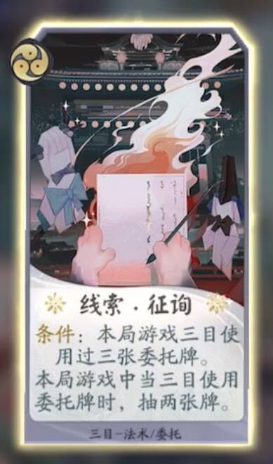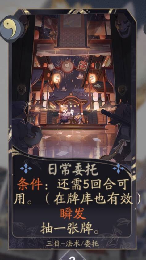 来达成瞬间的爆发过牌。三目觉醒打出线索之后,每日委托的效果就变成了不消耗鬼火过三张(因为觉醒·三目的效果,所以不是瞬发,而是真的不消耗鬼火。)我尝试过三勾第一回合直接过完牌库,但是这样会在书翁觉醒前直接疲劳死。建议大家给牌库里留几张牌。