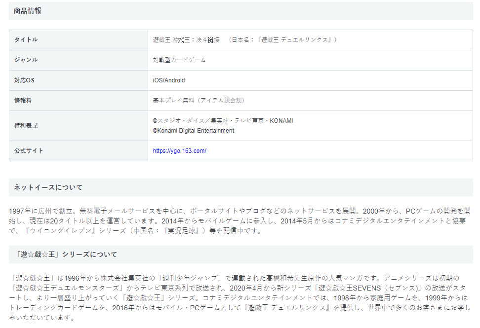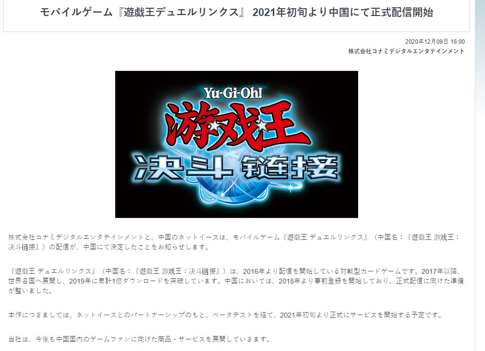 KONAMI数字娱乐有限公司和中国网易很高兴地通知你,手机游戏"遊戯王 Duel Links"(中文名称:"遊戯王 游戏王:决斗链接")的发行已在中国确定。