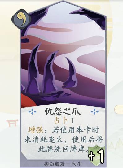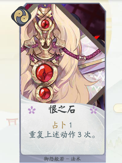 设计思路:此牌为御怨般若在一勾阶段通过占卜来主动发动式神能力的唯一手段。同时,增强效果与御怨般若能力相呼应,使用得当的话,在一局游戏中可以多次使用此牌发起攻击。