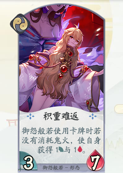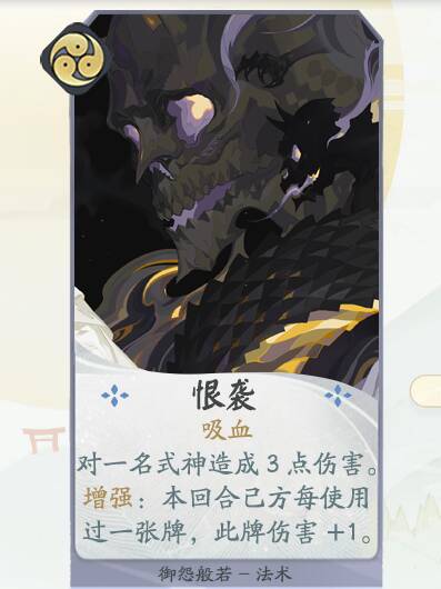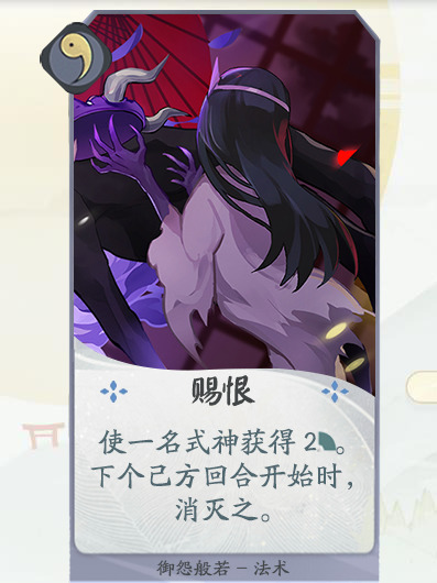 设计思路:结合御怨般若式神形象设计。御怨般若作为“对仇恨有求必应的神”,会赐予抱有怨恨之人强大的力量,但使用这力量也要付出相应的代价。使用此牌可以短暂提高我方残血式神力量用于进攻/换人/站场,也可以通过此牌解决敌人后方式神。