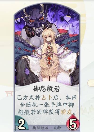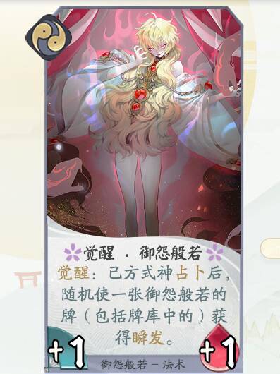 觉醒:己方式神占卜后,随机使一张御怨般若的牌(包括牌库中的)获得瞬发。