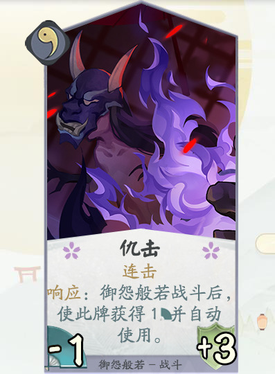 设计思路:这张卡作为一勾战斗卡有着+3盾的加成,但相应地有着-1力量的减益,且御怨般若本身力量值较低,主动使用的情况下收益较小。但在回合外响应使用时就会发挥较强力的效果。搭配御怨般若本身的能力,获得瞬发后的此牌能让对方非常头疼。