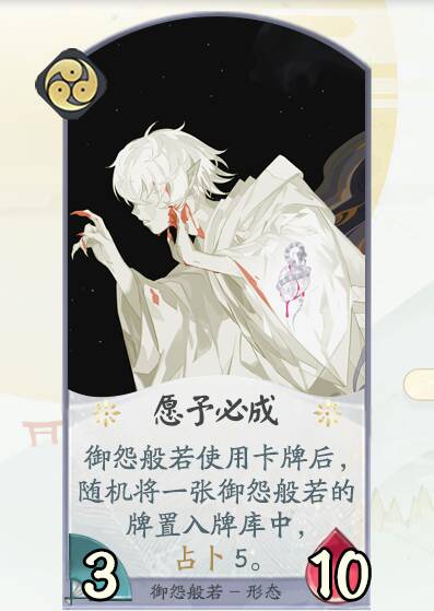 御怨般若使用卡牌后,随机将一张御怨般若的牌置入牌库中,占卜5。