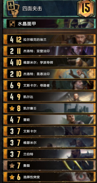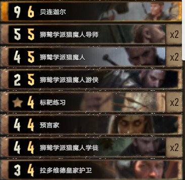 - 点数支持:被增益后的三基佬(12-15点)雷欧(配合铺场12点左右)狮鹫派掌门人(15点以下)寻路者(7p引擎)贝连加尔(9点)猎魔人学徒与凯尔达(持续引擎,配合4p法术及选择性突变)维瑟米尔-学派导师(全场加一,配合铺场等)