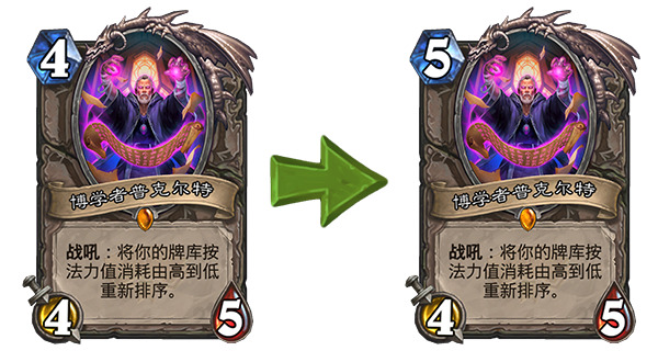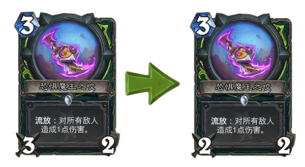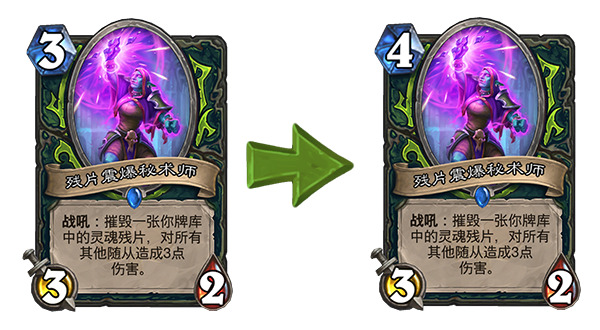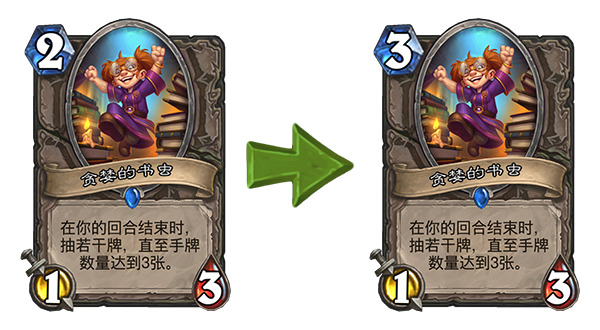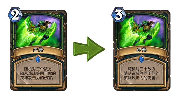 明天的削弱主要是为了降低恶魔猎手的整体强度。恶魔猎手在高分段的热度每周都见涨,上周已经达到35%了。由于它的两种形态(快攻瞎和残片瞎)的强力组件不同,我们削的时候也是分开进行的,像恐惧魔王之咬、贪婪的书虫和博学者普克尔特的削弱就是为了减少快攻瞎目前所拥有的续航和直伤能力,而对于残片瞎,我们削刃舞和残片震爆秘术师则是为了降低其清场效率。其中刃舞这张牌(的问题)在于它随着恶魔猎手加攻的手段不断累积(双刃斩击的改动,新武器,等等)变强了很多,以至于违背了这个职业所应有的弱点,也就是解大怪的能力。