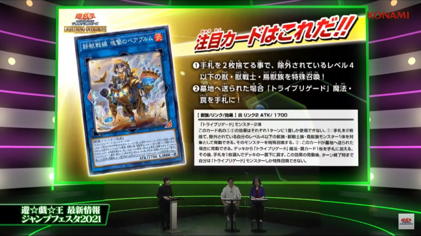 鉄獣戦線 塊撃のベアブルム 兽族/连接/效果 炎 LINK-2 1700/- 「トライブリゲート」怪兽2只 这个卡名的①②的效果1回合各能使用1次。 ①:丢弃2张手卡,以除外的自己的1只4星以下的兽族·兽战士族·鸟兽族怪兽为对象才能发动。那只怪兽特殊召唤。 ②:这张卡被送去墓地的场合才能发动。从卡组把1张「トライブリゲート」魔法·陷阱卡加入手卡。那之后,选1张手卡回到卡组最下面。这个效果的发动后,直到回合结束时自己不是「トライブリゲート」怪兽不能特殊召唤。