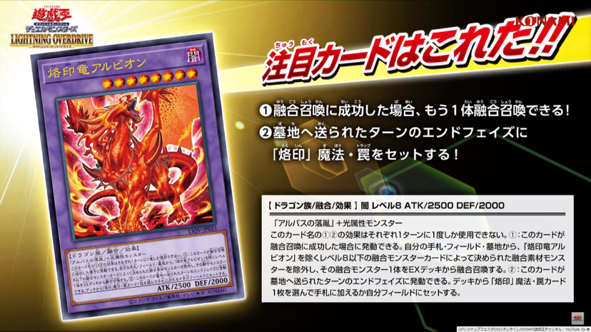 烙印竜アルビオン 龙族/融合/效果 暗/8星 2500/2000 「阿不思的落胤」+光属性怪兽 这个卡名的①②的效果1回合各能使用1次。 ①:这张卡融合召唤成功的场合才能发动。从自己的手卡·场上·墓地把除「烙印竜アルビオン」外的8星以下的融合怪兽卡决定的融合素材怪兽除外,把那1只融合怪兽从额外卡组融合召唤。 ②:这张卡被送去墓地的结束阶段才能发动。从卡组选1张「烙印」魔法·陷阱卡加入手卡或者在自己场上盖放。