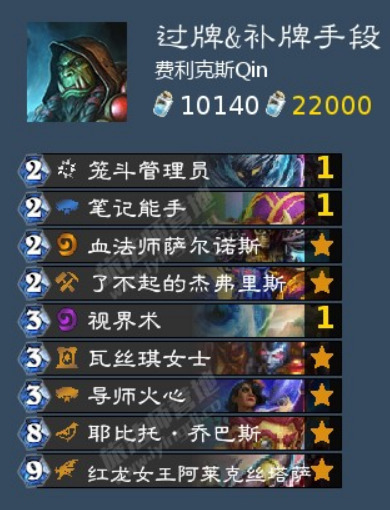 其实分为两种过牌手段,一是过牌库的手段,二是补牌手段。笔记能手在这套牌非常万能,对阵圣契骑回手妖术和衰变飞弹,对阵瞎子回手女巫杂酿(我认为这张牌是对阵瞎子最重要的砝码)缺过牌回手视界术,缺伤害回手各种直伤牌。而带耶比托·乔巴斯是因为卡组基本都是战吼牌,除了过到活动喷泉之外,其他牌1-1都不亏,还能快速过滤牌库,是非常重要的过牌手段。瓦丝琪女士则是完美契合这套卡组的需求(法强+过牌),快速过滤牌库加快克苏恩,破碎之劫的登场