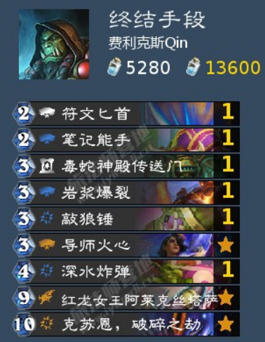 打撕牌术也不是毫无机会,我的渡劫局就是打撕牌术,8费解决了战斗。术士的缺点就是回血量不太多,且不稳定,所以打撕牌术我会打得很凶悍,首先你要清楚你是不可能靠克苏恩,破碎之劫赢的,所以你要用前文提到的第一种终结手段。我们的直伤非常多,且前期术士没什么随从,所以前期留姐夫,笼斗管理员,过到敲狼锤直接配合生物锤脸。手里留好深水炸弹,毒蛇神殿传送门和熔岩爆裂等直伤,必要时空场的话甚至可以笔记能手回手克苏恩之眼,配合符文匕首和雷霆绽放打出单回合17点的斩杀。