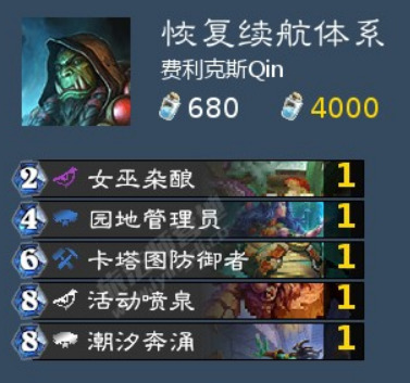 前文有提到,女巫杂酿是对局瞎子的关键牌,基本上解到后期瞎子只能锤脸的话,女巫杂酿+笔记能手基本能劝退瞎子。同时潮汐奔涌配合法强基本可以算作是一个雷诺。活动喷泉是老牌的萨满恢复手段,有个小技巧,7费回合挂个敲狼锤,8费上活动喷泉,8费59的喷泉节奏卡组的话会是非常恐怖的解场+回血手段。而园地管理员在我这个总共7张5费法术牌(3张AOE+4张克苏恩的4张牌)触发难度不大。