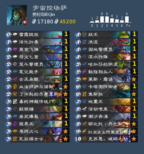 先上这个月冲上传说的最终完善的卡组。今年因为忙于工作弃坑了一段时间,近两个月回坑第一反应就是调试最新的控场萨卡组。笔者去年哈加莎的时代就一直钟情于构筑控场萨卡组,很喜欢那种通过自己的不断构筑和调试来上传说的感觉。那时候也给营地的各位老哥分享过一些心得,所以对控场萨这个分支算是比较有心得,有兴趣的可以看看我此前的链接:1)【标准传说】恩佐斯控场萨;2)【标准传说】防守反击控场战吼萨