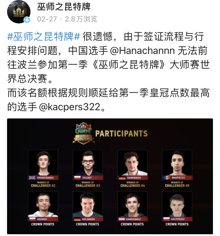 2月27日:因中国严峻的疫情形势影响,Hana无法获得签证,大师赛名额被取消。