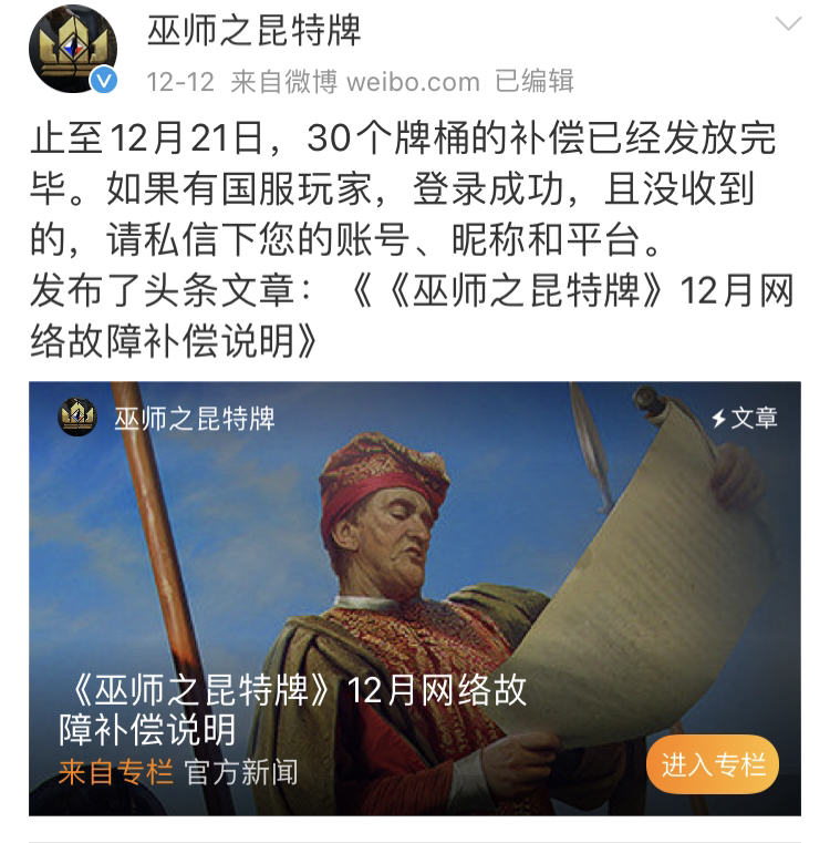 12月8日:猎魔人之道上线,国服迎来“灾难的停服四天”,玩家刚刚燃起的希望被无情熄灭。