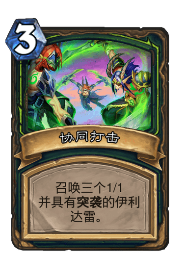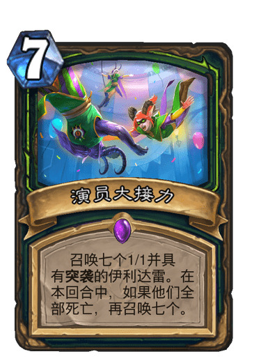 1)演员大接力:这张暗月版本卡牌我十分看好,可以一卡完成解场+站场的任务(配合暗月雕像、团队领袖、怒鳞纳迦),同时要要注意的地方也就是要保证触发它的二次效果,一定要将所有的伊利达雷弄死。注意场攻不要对面都解了还没死完(用暗月雕像、团队领袖控制)。配合怒鳞纳迦甚至可以10费解完德鲁伊的满场88小丑(前提是场上有几个杂毛或者暗月雕像、团队领袖)。