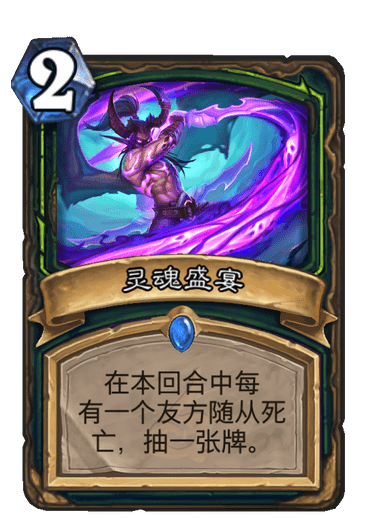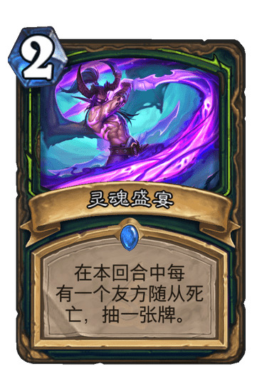 每死亡一个随从就+1+1,配合瞎子的无尽杂毛,在后期可以成长成一个非常恐怖的身材。50-50那都是常事,配合扫帚,和希拉斯暗月套装可以打出超越天际的斩杀。但是问题来了,它与暗月斩杀的组合费用太高了,高达14点,就算用古头开到费用也不够(除非开2张),有没有什么办法让它站住一回合呢,突然我眼前一亮,看到了这张卡: