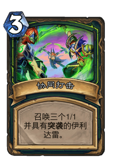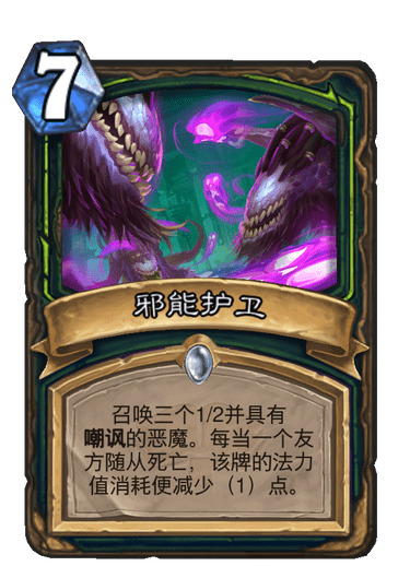2)邪能护卫:对阵快攻的神器,3个12嘲讽是让所有快攻都头疼的。面对控制卡组,铺场被解不要怕,我还能再铺一波,配合协同打击、棕红之翼我立马又满场了。下回合配合怒鳞纳迦、暗月雕像、团队领袖我就能扳回场面(打脸)。