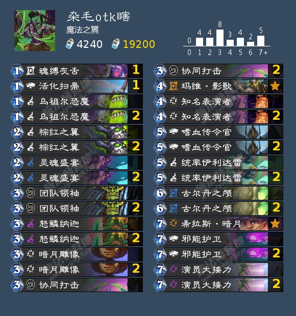 大家好,我是魔法之翼#521589,今天给大家分享杂毛瞎。说起瞎子想必大家一定会想到残片瞎、快攻瞎以及伊格诺思otk瞎。基本上天梯的瞎子都是这3类。今天我就试着来打破这个禁锢。其实瞎子的铺场能力堪称炉石最强想必大家不知道吧,在观察瞎子的所有卡牌后发现这样一件事情,瞎子的铺场堪称变态啊。那么为什么杂毛瞎最近火不起来呢,是因为瞎子buff手段较少,杂毛对付后期的大哥十分无力,导致后期疲软,但是马戏团的版本给杂毛瞎注入了新的能量,使杂毛瞎也可以在标准大放异彩。废话不多说,直接上卡组(这个加入了otk体系,偏向娱乐,要想稳定上分可以抄第二套卡组):
