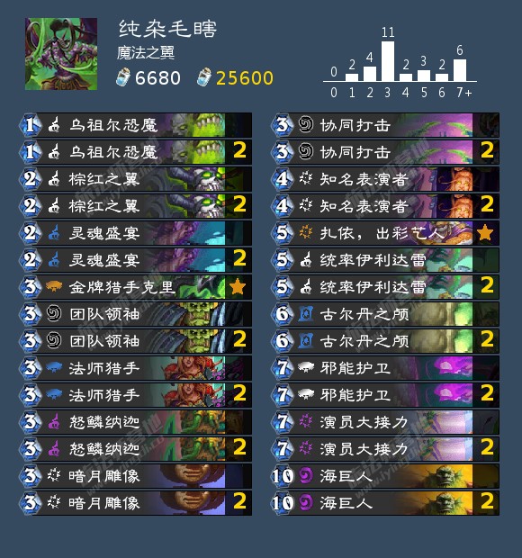 3)知名表演者:这张卡牌被我加入到杂毛瞎中,表现非常亮眼,亡语的2个11嘲讽躲在buff体系后面很舒服,而且能挡住2个攻击频率,让对面有劲无处使。
