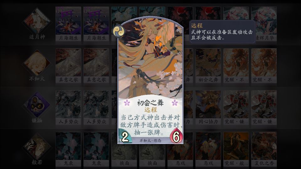 在这套卡组中,通过中期清辉月华的多次出击能为镰鼬积攒能量。到了三勾一般都至少有出击三四次的量。或是配合初会之舞抽牌,提升容错;或是直接用以斩杀。