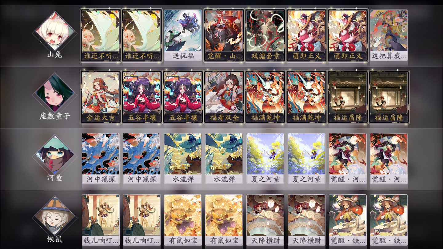 这套卡组的过牌真的非常优秀且稳定,所以带牌可以尽量贪,尽量多样化。比如山兔觉醒只带了一张,福满乾坤满编。座敷童子的主要职能就是前中期利用每回合白给的一次刷运势机会配合河童,三勾开启萌正后打火刷6。所以带牌也是完全向这方面靠拢的。