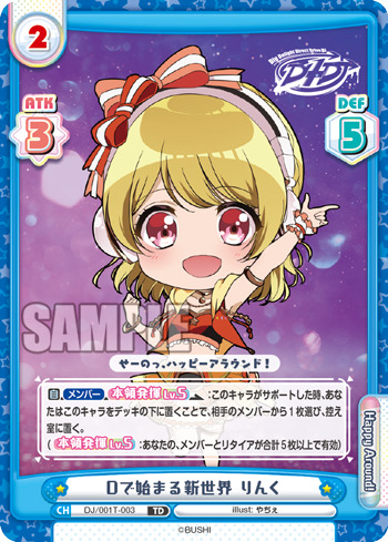 【自】【成员区】【Re配合】:这个角色支援时,你可以通过将这个角色送入卡组最下方,选择自己休息室中的一个角色,以横置状态放置到成员区,这次攻击中,被支援的角色+2/±0。