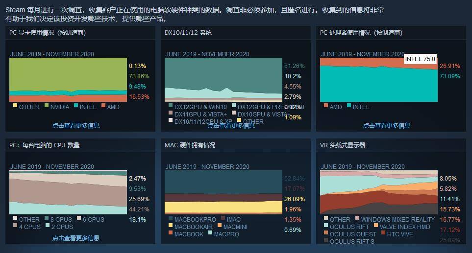 当一台新的设备安装Steam客户端后,Steam会询问用户是否参与他们的匿名硬件调查,调查汇总结果会在每月初公布。今日Steam公开了2020年12月硬件和软件调查结果。