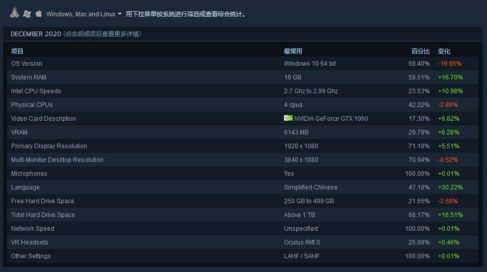 12月有好几项值得一提的变化:Win 10系统的比例下降了19.88%,而Win 7系统则一下子增长了22.35%;而16 GB内存的占比提高了16.7%,总占比达到58.51%。显卡方面,GTX 1060显卡占比上涨了6.82%,仍然是目前Steam上最主流的显卡。而简体中文用户占比大幅提升30.22%,再次成为Steam平台最常用的语言,不知道这是不是国内很多新玩家为了玩《赛博朋克》而首次下载了Steam?