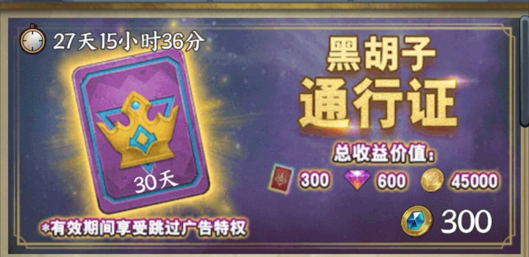 这是我个人推荐的一个付费项目,与其交通行证,月卡这个称呼是比较合适的。黑胡子通行证只有一个用处:跳过游戏中所有的广告。上述每日活动的奖励都要观看30s的广告,再算上等待和结束的时间,实际下来可能要40s。而拿满上述每日活动的奖励需要看20次广告,大约是13分钟,而且广告的质量也一言难尽。所以如果你想拥有一个良好的游戏体验,十分推荐购买这个黑胡子通行证。售价30元持续30天,每天只要一元钱,就能省去十几分钟的广告时间,美滋滋地开上两包卡,香!