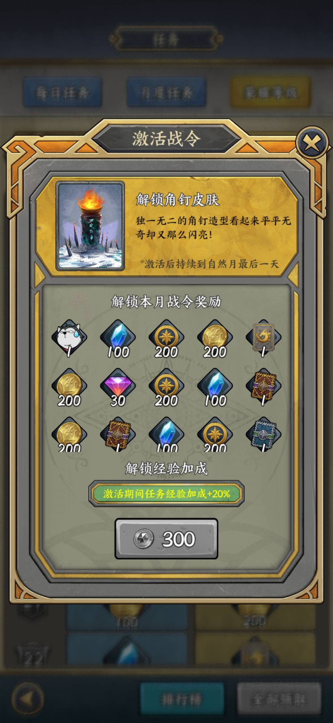 这个就是正常意义上地通行证,游戏中有每月任务,完成之后会给经验值,经验值用来提升通行证地等级。通行证分免费版和高级版,这里地免费版每级也是有奖励地,值得肯定,30元付费解锁高级版后可以额外获得8个卡包、4张竞技场门票、专属表情和角钉皮肤,以及海量的钻石、金币、荣誉值等。通行证的有效期也是30天,每天正常游戏即可完成,无需额外的肝度,稍有余力的玩家可以考虑入手。