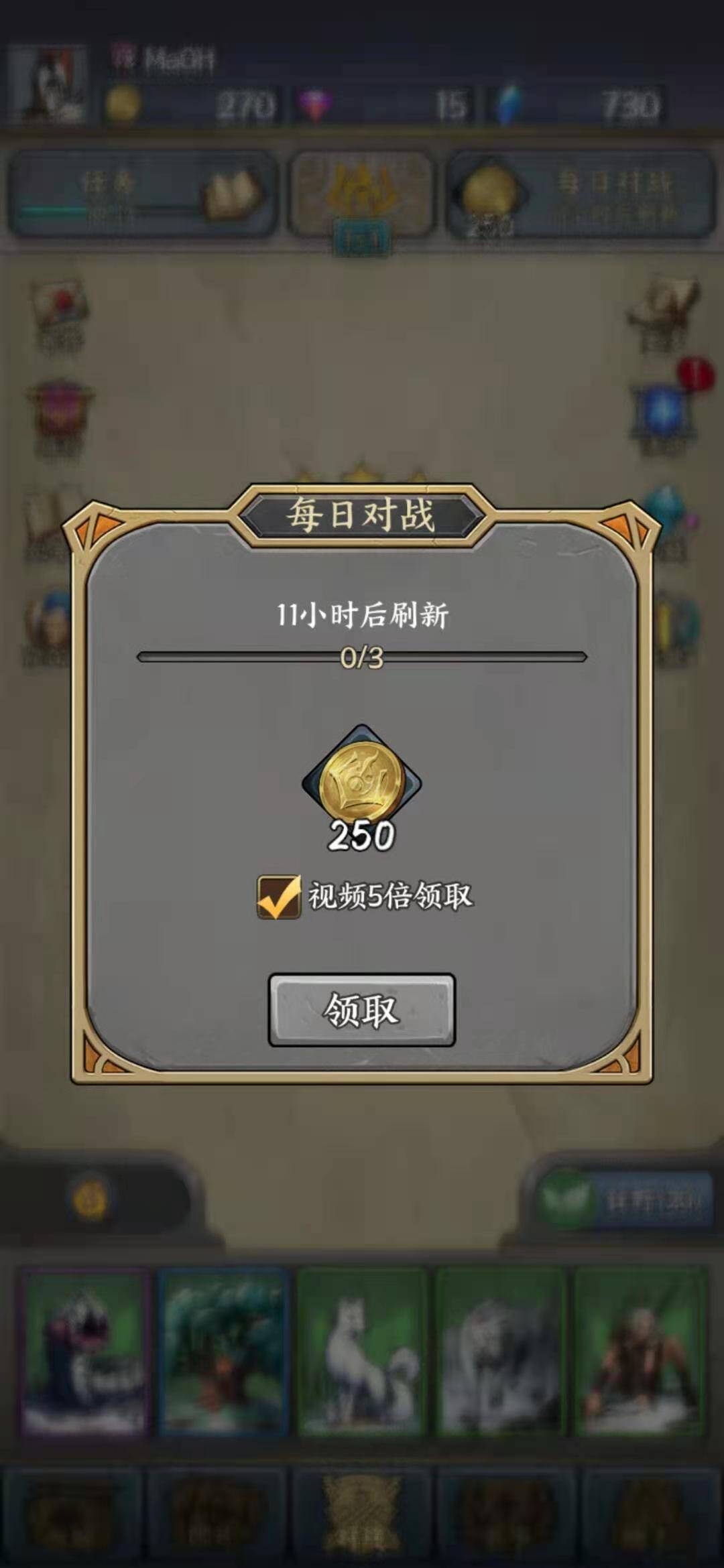游戏中,每天前5次战斗胜利后奖励的10金币,可以选择观看广告领取10倍也就是100个,这样有可以赚到500枚金币