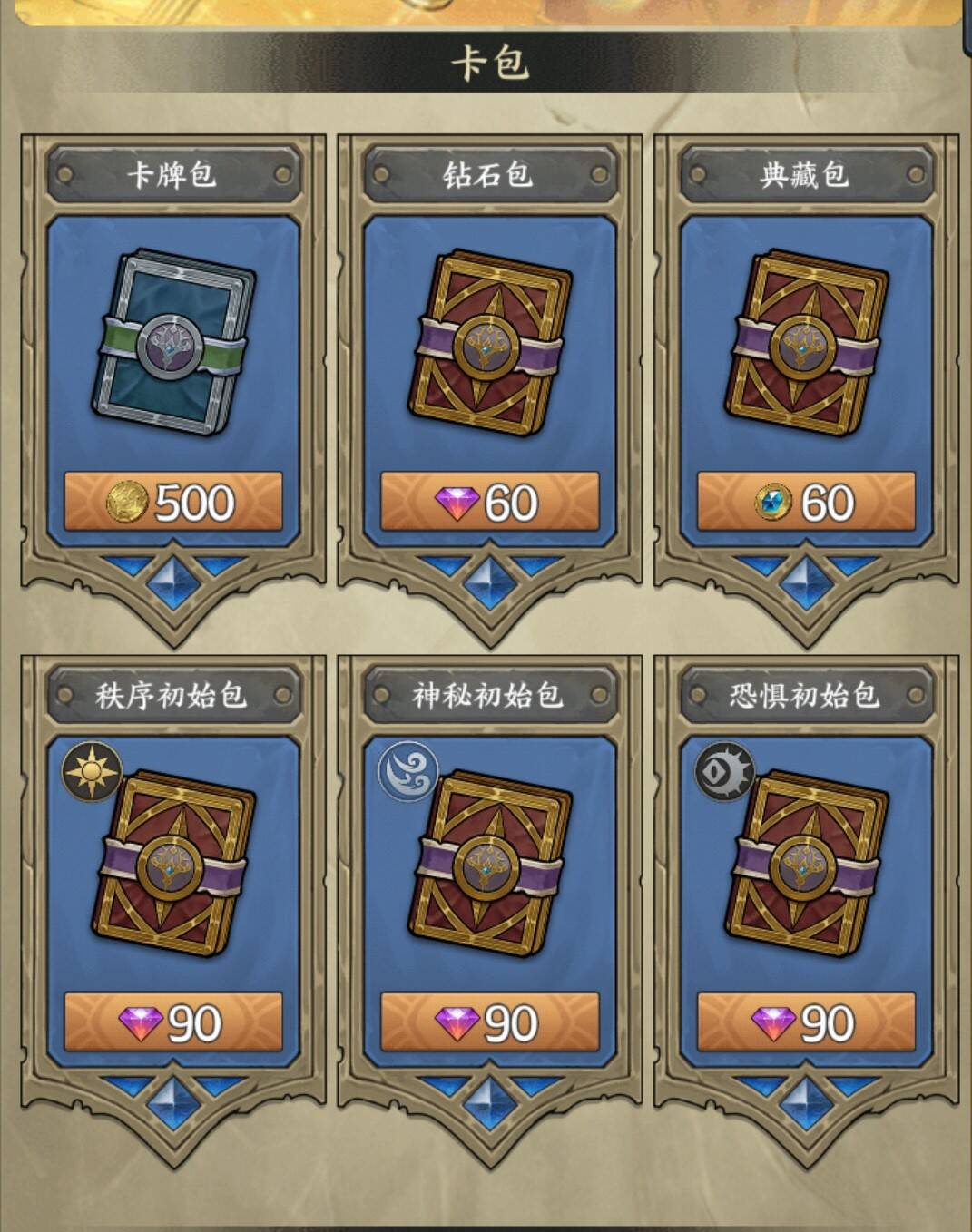 游戏解锁卡牌包功能后还会售卖阵营卡牌包,五大阵营各限购一次,90钻石一包,保底一紫二蓝。新手可以攒一攒钻石把这些买掉,保底一紫真的很香,过了这村就没这店了