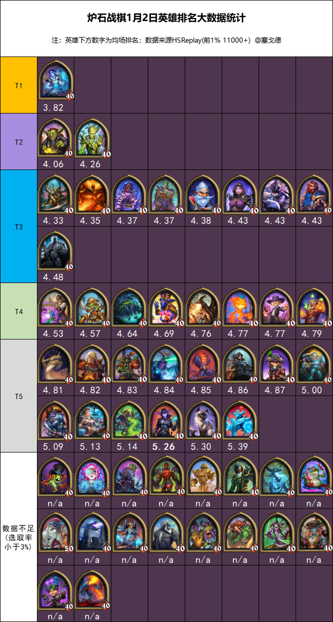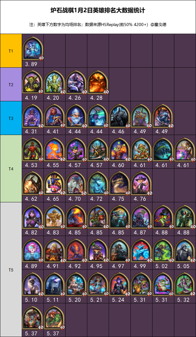 大家好,我是塞戈德,我又来发酒馆战棋的大数据排名啦~ 本周是19.2版本更新的第3周,本周前50%以上玩家积分升至4200+,英雄排名一图流,数字为均场排名
