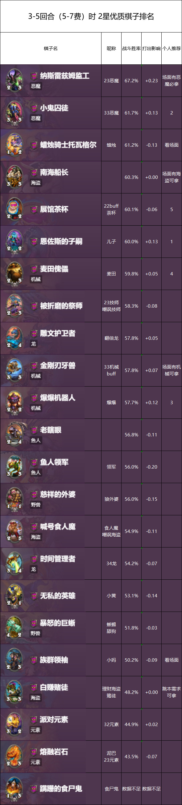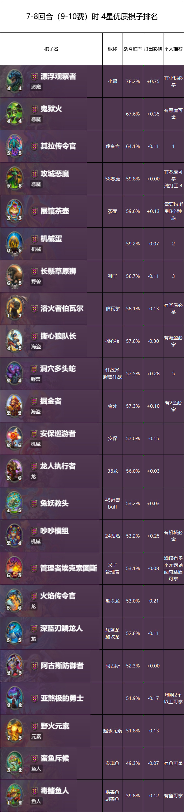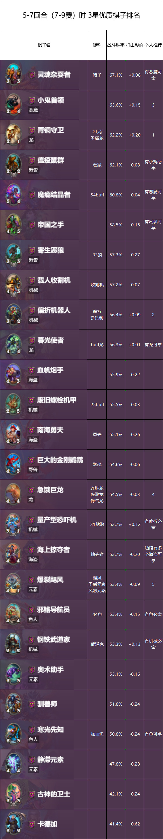 7-9费是拿3本随从的回合,如果是纯打工我还是建议优先拿21圣盾龙和偏折,毕竟有圣盾,将来走鸡杂、光牙都有比较大空间,即便其他流派也会在阵容里用很久。圣盾元素我也比较喜欢拿,但看数据似乎比圣盾龙和偏折低很多,小鬼首领在早期4血大概率能出2个小鬼,总身材还是不错的,即便之前没小粉纯打工也还行。其他随从基本还是看场面。