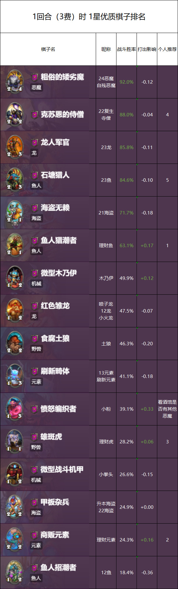 数据中的战斗胜率为当前回合战斗时的期待胜率,就是下了这个棋子有多少几率战胜对手;打出影响为打出这个棋子后影响最终排名的浮动,例如你开局就拿到了理财鱼,那么你就有更大的转型空间,直接体现在均场排名就上升了0.17;战斗胜率可以看作短期收益,打出影响可以看作长期收益,比如你快要死了肯定想着能活过下一回合那么就优先选取能直接提升战斗胜率的棋子,而如果在早期或血量健康可以优先考虑打出影响更高更灵活的棋子。