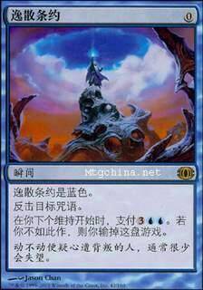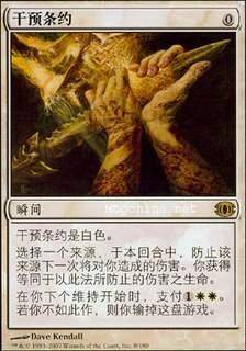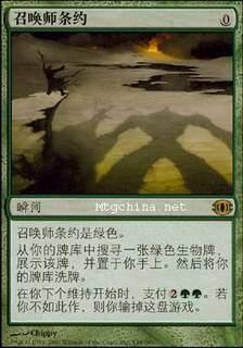 我们的一号计划是来自预知将来系列的条约循环。条约是很奇怪的一类牌——它们不需要支付费用即可施放,然后在你的下个维持要你做出回应。以召唤师条约为例:你可以免费从牌库里找出一张绿色生物牌,但在你的下个维持开始时,你必须支付2GG的费用,否则就会直接输掉游戏。