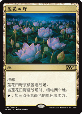 这套牌的两个游戏计划都需要集体心智在场,如何结算这个六费的结界也是个不小的问题。我们的加速组件有五色棱镜和莲花田野,两者都能产出两点额外法术力,允许我们早在第四回合结算集体心智。五色棱镜没什么好说的——一个临时产费神器罢了;但莲花田野需要花点功夫才能变成合格的加速单卡,毕竟它进场时要求我们牺牲两块地……