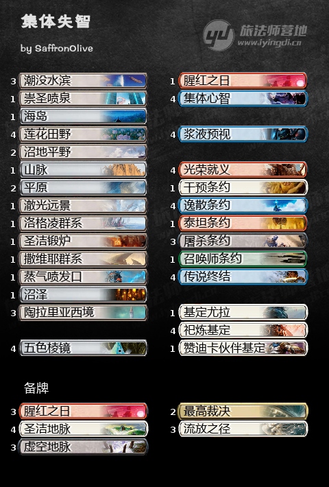 配合集体心智,合适的条约牌能让我们立即取得胜利。我们的思路是加速拍出集体心智,然后立刻施放一张对手套牌不具有的颜色的条约。集体心智会强制对手施放这张条约的复制品,让他们在下个维持开始时因为无法支付该种颜色的费用而落败。如果手牌里缺少条约,我们甚至可以用陶拉里亚西境来易质到最合适的那一张!