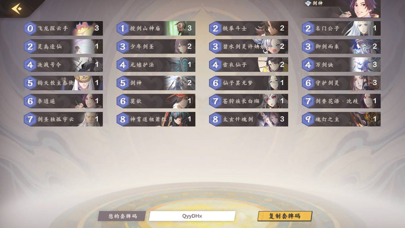 《飞龙探云手》+《授剑山神庙》、《铁拳斗士》、零费牌+《御剑而来》、《元墟护法》、《剑圣独孤宇云》、《碧水剑灵徐姌娘》+《剑神》、《决战号令》……