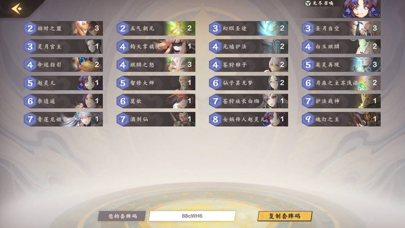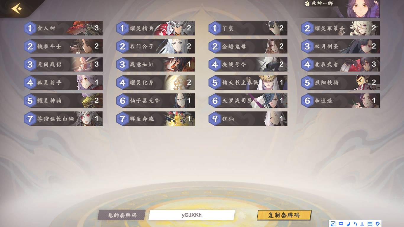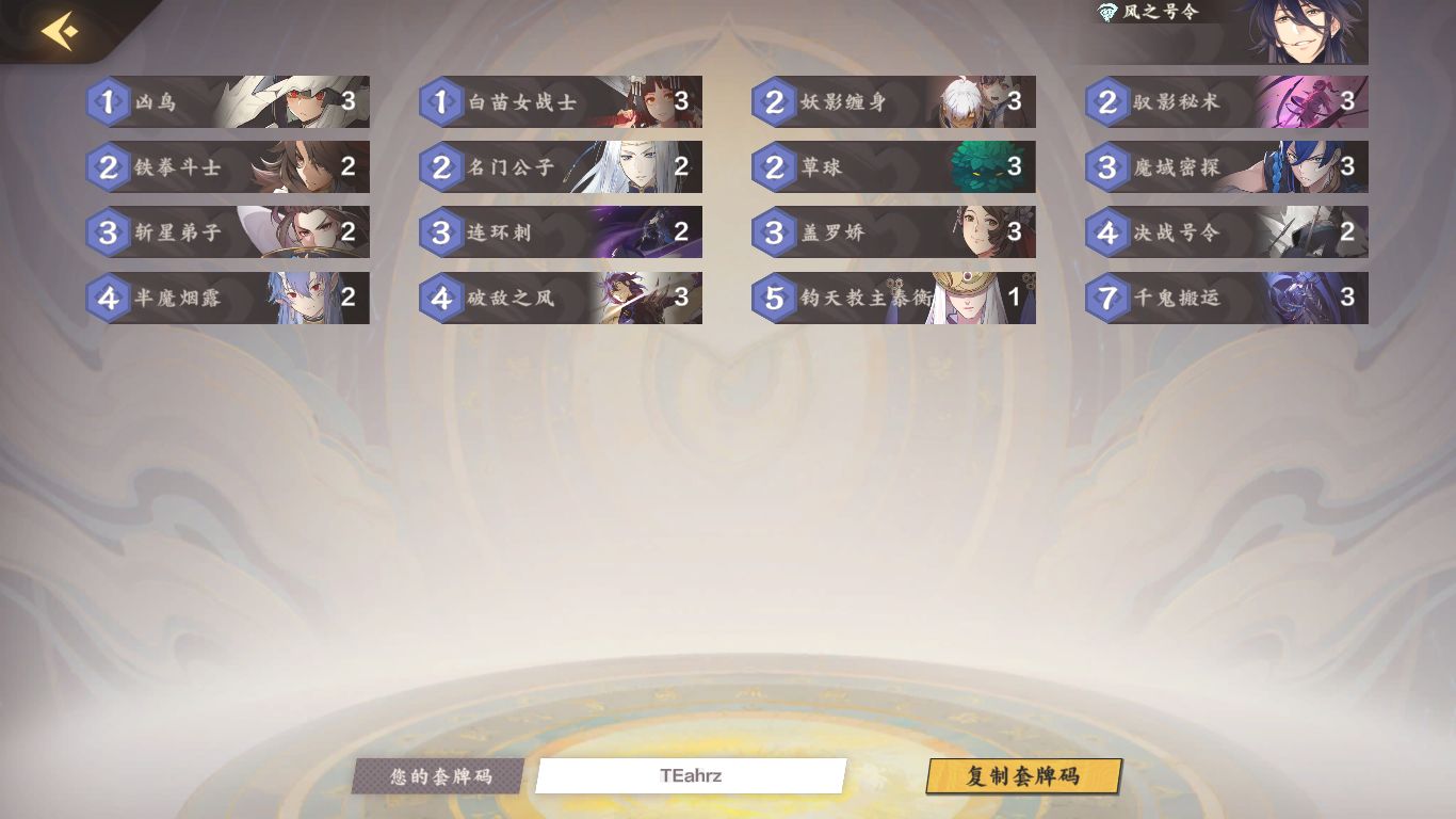 一费部署、二费部署、三费《无间战侣》、四费《决战号令》或《北辰武者》、五费《烈阳铁骑》、六费《天罗战司展擎空》。
