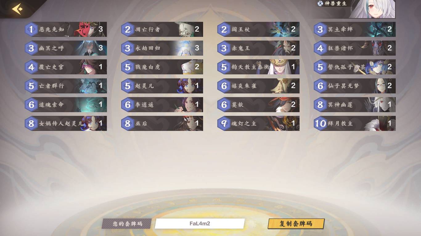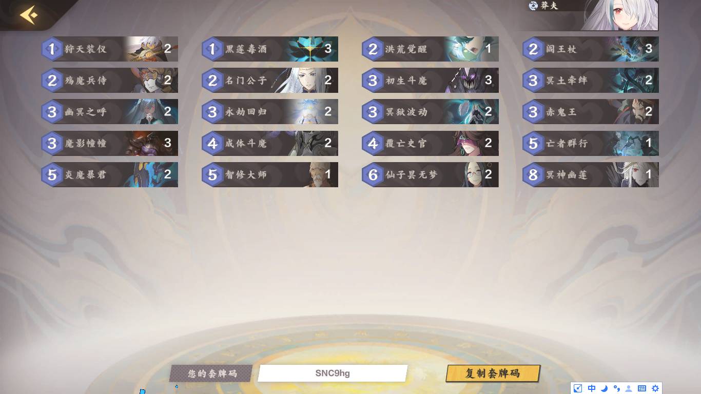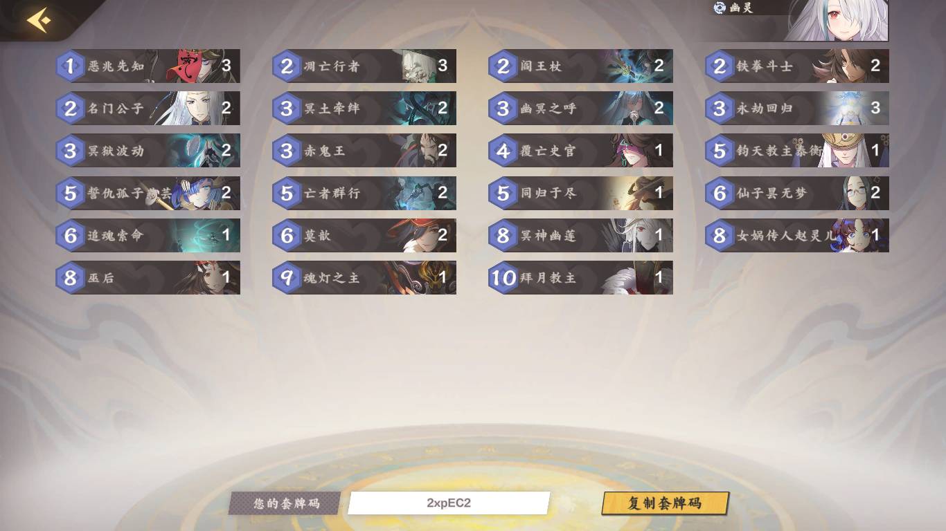 开局需要将手牌切换为:《冥狱波动》、《冥土牵绊》、《阎王杖》、《幽冥之呼》。通过手牌效果来不断召唤亡灵,强化亡灵。